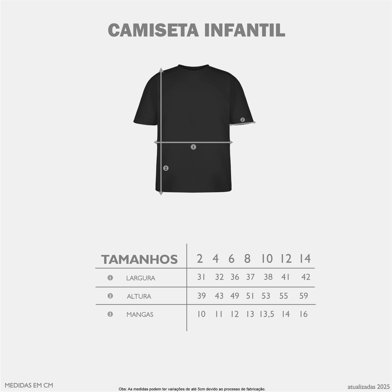 Camiseta Infantil linha Kids confeccionada em tecido de meia malha, fio 30.1, cardada, com 100% algodão e gramatura 165 gramas. Essa malha, se encaixa perfeitamente em qualquer biotipo, possui gola com reforço, mangas curtas e gola rebatida. Ideal para pais exigentes que se preocupam com os mÃnimos detalhes.